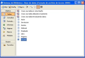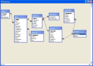 En las imágenes siguientes muestro un sitema relacional para biblioteca elaborado en Visual Basic 6.0 y bases Microsoft Acces. En ellas vemos las diversas tablas utilizadas y las relaciones entre ellas.